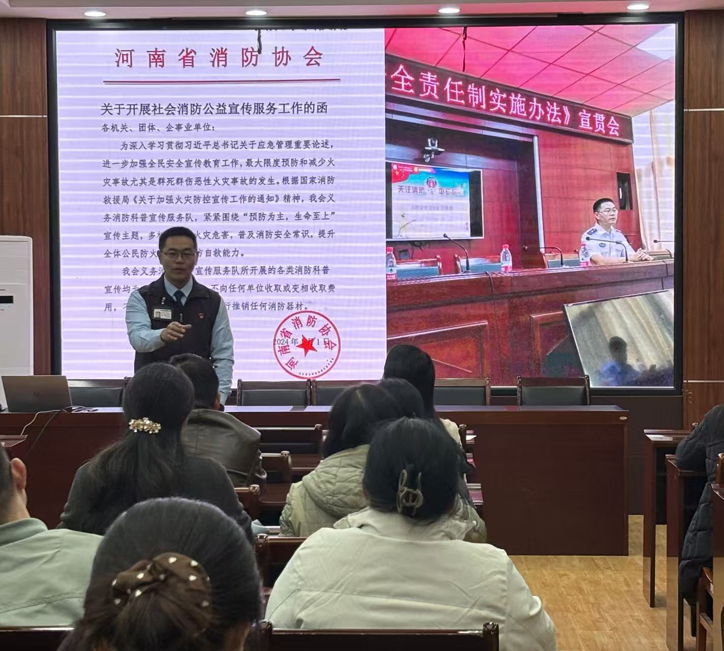 大家集中学习了《中华人民共和国消防法》和《河南省消防条例》《河南省教育系统消防安全责任追究实施细则》等法律法规及政策规定的主要内容。随后,杜通教员通过“图文+视频”的直观形式展开讲解,内容紧密贴合日常生活与工作场景,兼具实用性与警示性。一方面聚焦安全技能,详细讲解家庭火灾逃生路线规划、厨房燃气、电器安全操作等实用技巧,帮助教职工掌握应急避险方法;另一方面强化隐患认知,通过播放电动车充电自燃实验等视频,直观揭示违规用电的危害,同时现场演示灭火器、消防栓等器材的正确使用步骤。结合生动案例对有关法律法规相关条款进行解读,让教职工在了解安全知识的同时,明确消防安全的法律责任,实现“安全警示+普法宣传”双重效果。