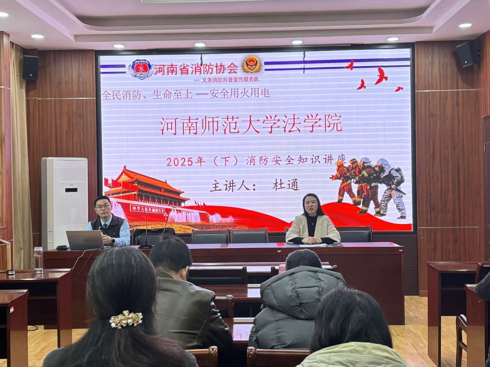 为强化教职工消防安全意识,筑牢校园安全防线,按照校2025年119消防宣传月活动方案工作要求,11月11日下午,法学院在崇法楼301会议室开展以“全民消防 生命至上——安全用火用电”为主题的消防安全知识讲座。河南省消防协会宣传教员杜通受邀担任主讲人,全体教职工参会,讲座由法学院副院长、分工会主席史春花主持。