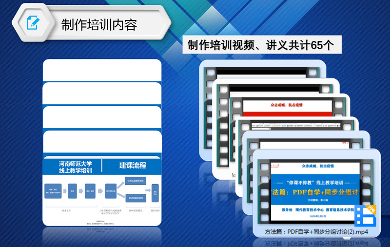 期间中心制定我校《教师培训工作方案》,组建校级教师培训专家团队,成立了教师培训工作组,采用“校院分层、分步实施”的方式培训教师1430人,指导教师建课2500余门,制作培训视频和文档材料60余部,完成如何利用平台建课、授课和资源开发等各类指导、答疑两千多条次,有力的保障了我校在线教学的正常开展。