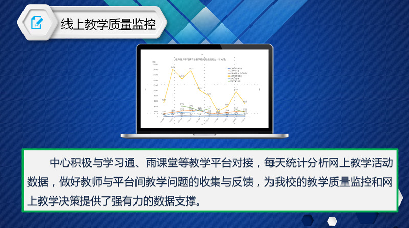 同时,中心积极与学习通、雨课堂等教学平台的沟通,做好注册登录数据对接,及时统计分析线上教学数据并上报教学专班,为我校线上教学决策提供强有力的数据支撑。另外,中心还积极协助配合教务处圆满完成了线上教学质量监控工作。