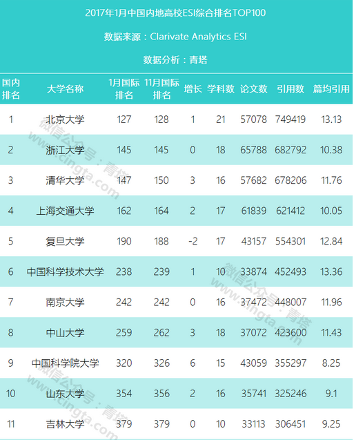 本期青塔统计了Clarivate Analytics公布的2017年1月ESI最新数据中国内地高校TOP100的情况,并与2016年11月进行了对比。
