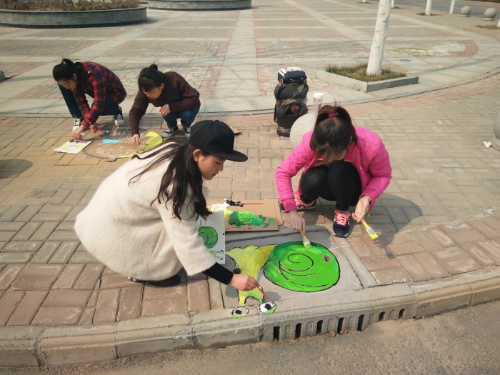 井盖涂鸦以学院校园内主干道的井盖和排水口为平台,结合井盖特点,美术学专业的同学们在校园内如火如荼地开展了创意涂鸦。大眼萌的小黄人、萌萌哒的长草君、粉嫩的小牛、威猛的白虎和“手护”地球等漫画元素被同学们栩栩如生地绘制出来。在同学们的努力下,原本毫无生气的井盖和排水口,纷纷换上了“新衣”,这些焕然一新的井盖将文化艺术融入校园,使春日的校园更加生机盎然。