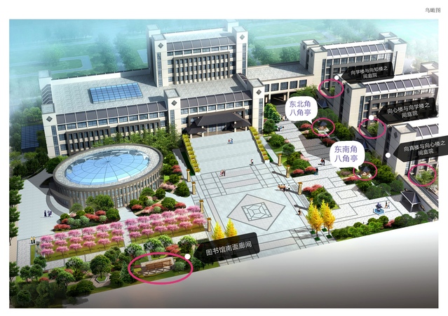 3.向真楼与向心楼之间庭院命名、向心楼与向学楼之间庭院命名、向学楼与向知楼之间庭院命名。