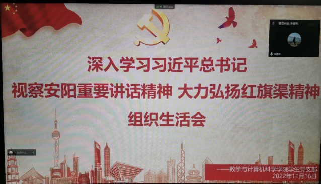 为深入学习贯彻党的二十大精神和习近平总书记视察河南安阳重要讲话精神,促进支部党员汲取信仰力量,更好地坚定理想信念,2022年11月16日上午,数学与计算机科学学院学生党支部召开“深入学习习近平总书记视察安阳重要讲话精神,大力弘扬红旗渠精神”专题组织生活会。本次会议采取线上的方式进行,支部全体党员参加会议。
