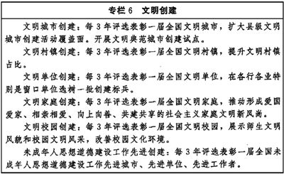 以实施文明创建工程为抓手,推动文明培育、文明实践、文明创建不断深入。创造性开展文明城市、文明村镇、文明单位、文明家庭、文明校园和未成年人思想道德建设工作先进等精神文明创建活动,拓展新时代文明实践中心建设。弘扬科学精神,深入开展爱国卫生运动,深化文明餐桌行动和“光盘行动”,倡导文明健康、绿色环保的生活方式。健全志愿服务体系,广泛开展志愿服务关爱行动。加强网络文明建设。(见专栏6)(见专栏7)