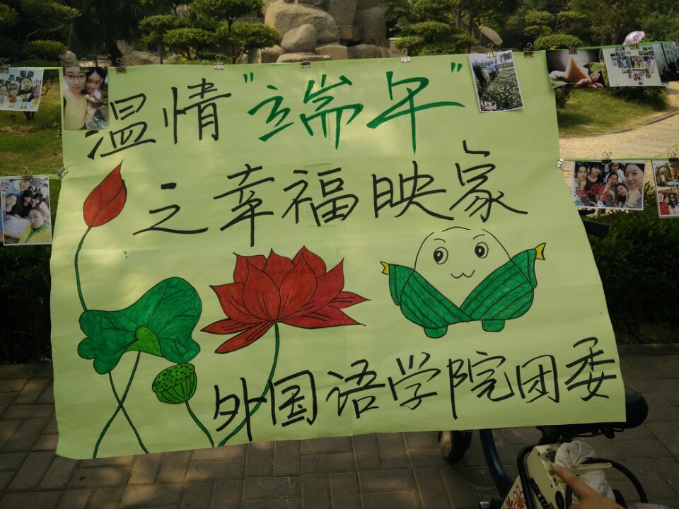 外国语学院举办“温情端午”系列特色活动 六月夏半,粽米飘香。端午节来临之际,为弘扬传统文化,加深大学生端午印象,并丰富校园活动,外国语学院于6月17日起开展“温情端午”系列特色活动。此次活动由外国语学院团委主办,各部门积极参与。 活动前期,我们于6月17日通过微博公众平台向同学们发起“温情端午——短信不群发”倡议书,以此来号召大家用心体验传统文化韵味,拉近彼此距离。随后,又通过微博发起“温情端午,我有话说”话题,号召大家编辑微博祝福短信为家人朋友送祝福并参与我们的有奖活动。同学们积极转发、响应,并表示拒绝短信群发,从而表达同学们的真切情感。有奖活动更是调动了学生们的参与氛围。6月18日,我院于西区万人餐厅西厅主干道举办“温情端午之幸福映像”摄影展,对同学们上交的照片进行张贴,以展示同学们与亲人、友人的温情瞬间,表达端午情浓的美好愿望。此次摄影展吸引了众多同学的观赏。 此次系列活动的开展,不仅丰富了校内的端午节文化活动形式,也寄托了学生的思家情怀,有利于学生人文情怀的培养和学院内文化建设的提高。 (外国语学院 乔 栋 责任编辑 叶 钊)