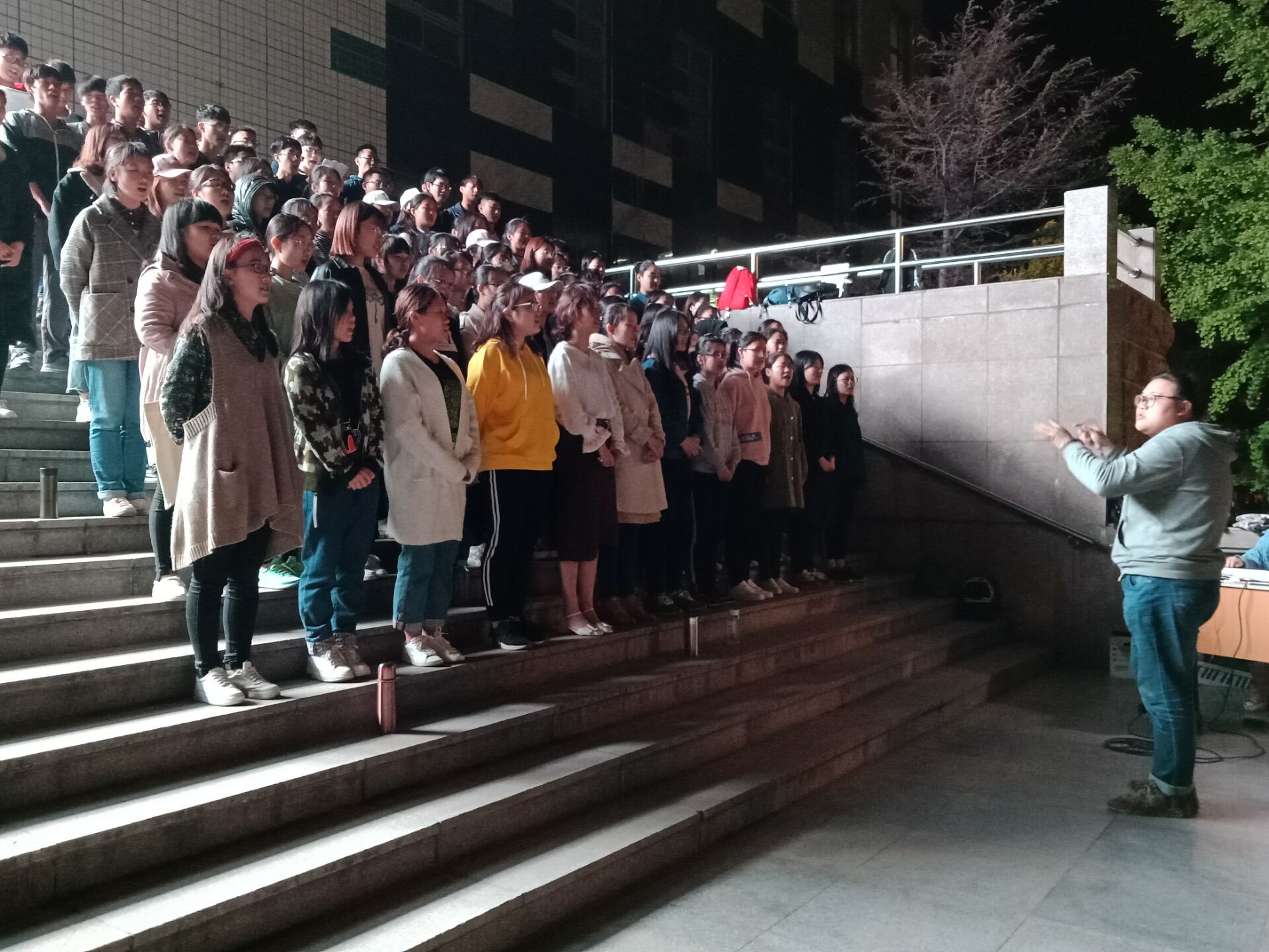 双歌比赛的参加人员从四月伊始就开始了,经过考核,最终组建出了属于我们学院的双歌队伍。尽管双歌比赛原定是在四月末进行比赛,但是训练开始的却很早。在选拔结束后的第二晚,训练就开始了。