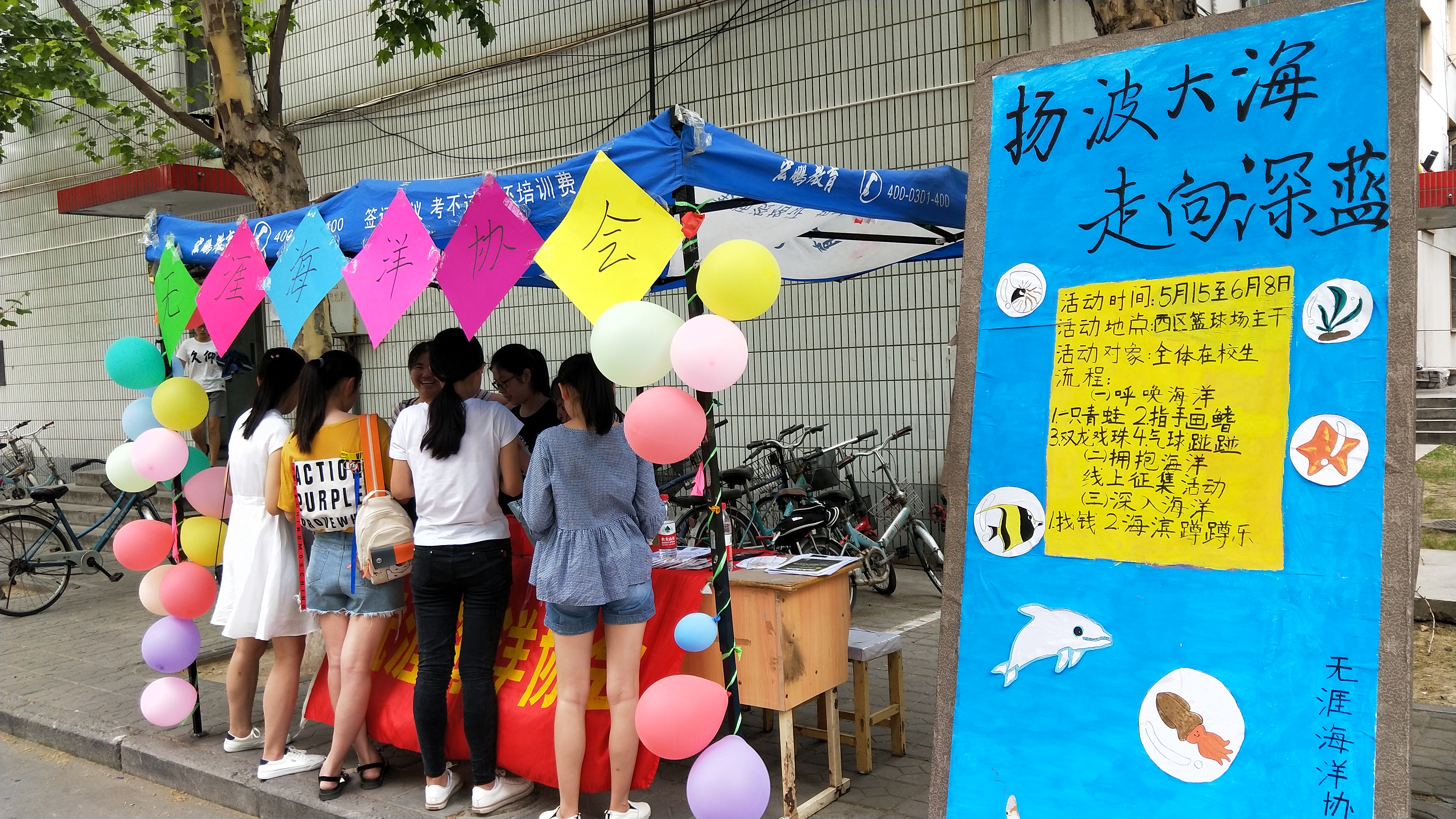 水产学院的无涯海洋协会展开了海洋月系列活动,分为线上和线下活动。线上我们推出了海洋月征集活动,参与方式有文字、视频、标语、海报等一系列方式。而线下,我们在校内摆出摊位,学生随机抓阄答题,各种海洋小知识任你选择,题目答对一定数目可以获得精美小礼品、如:多肉植物、花环、糖果等。线下除了抓阄还有各种“惊险刺激”的小游戏,海滨蹲蹲乐、找钱、还有互动合影几个游戏,这些游戏不仅仅拉近了人与人之间的距离、不仅仅让大家获得了快乐,也让大家深一步的了解了海洋知识、对海洋生态有了更深刻的概念。保护海洋动物、海洋生态环境人人有责。