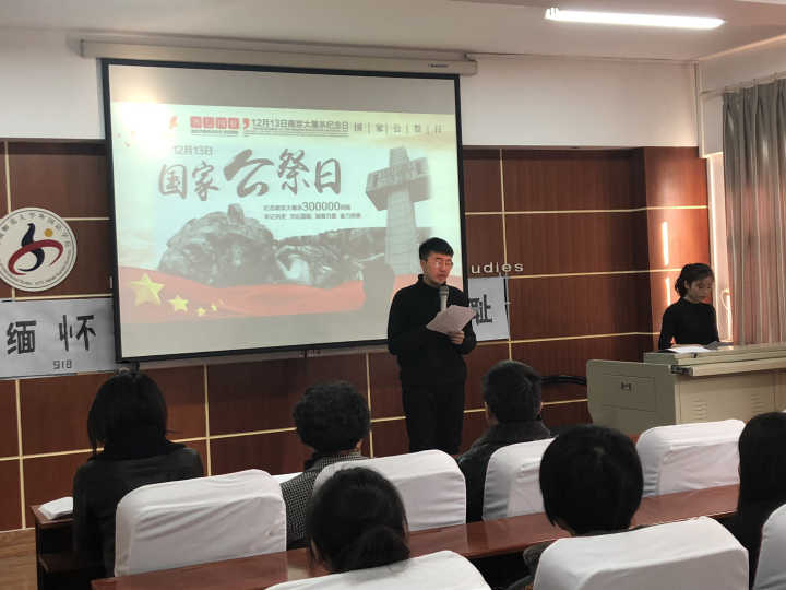 为缅怀先烈,同时加强大学生民族思想意识建设。 12月13日,外国语学院举行“缅怀先烈遗志,勿忘南京国耻”主题会议。党委书记宋霞,党委副书记曹崇,团委书记唐新出席本次会议。18级各支部成员到会。本次会议由外国语团委院社联干部马丽姣主持。