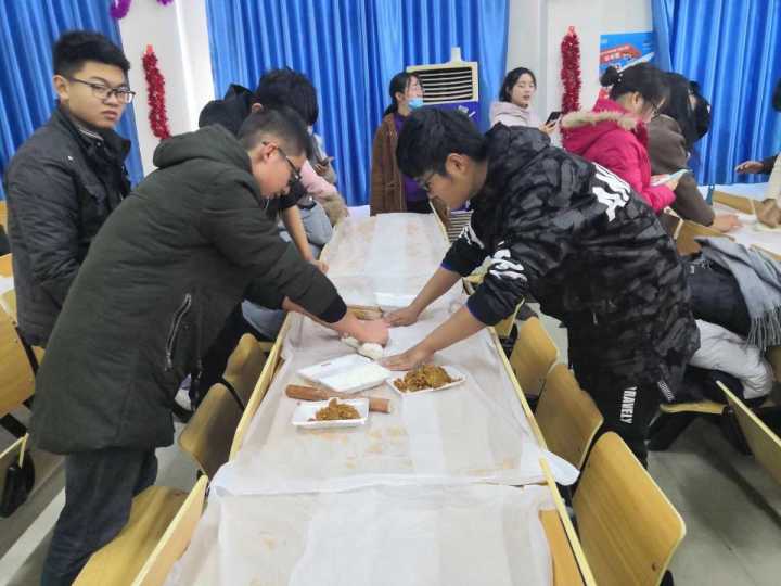 活动开始后 ,大家自动分好小组,拿到分配好的原材料后,就迫不及待的开始准备,各个小组的成员分工明确,和面的和面,擀面皮的擀面皮,包饺子的包饺子,场面甚是热闹。其中我们的亲爱的辅导员熊老师更是与同学们进行了亲切的互动与体验,大家像一家人一样不时地交谈。每组学生别出心裁地包着饺子并设计成各种形状,有精致小巧的柳叶饺,有形如元宝的元宝饺,还有小笼包似的饺子......看着自己亲手包出的饺子,每个人心里都洋溢着快乐和自豪。