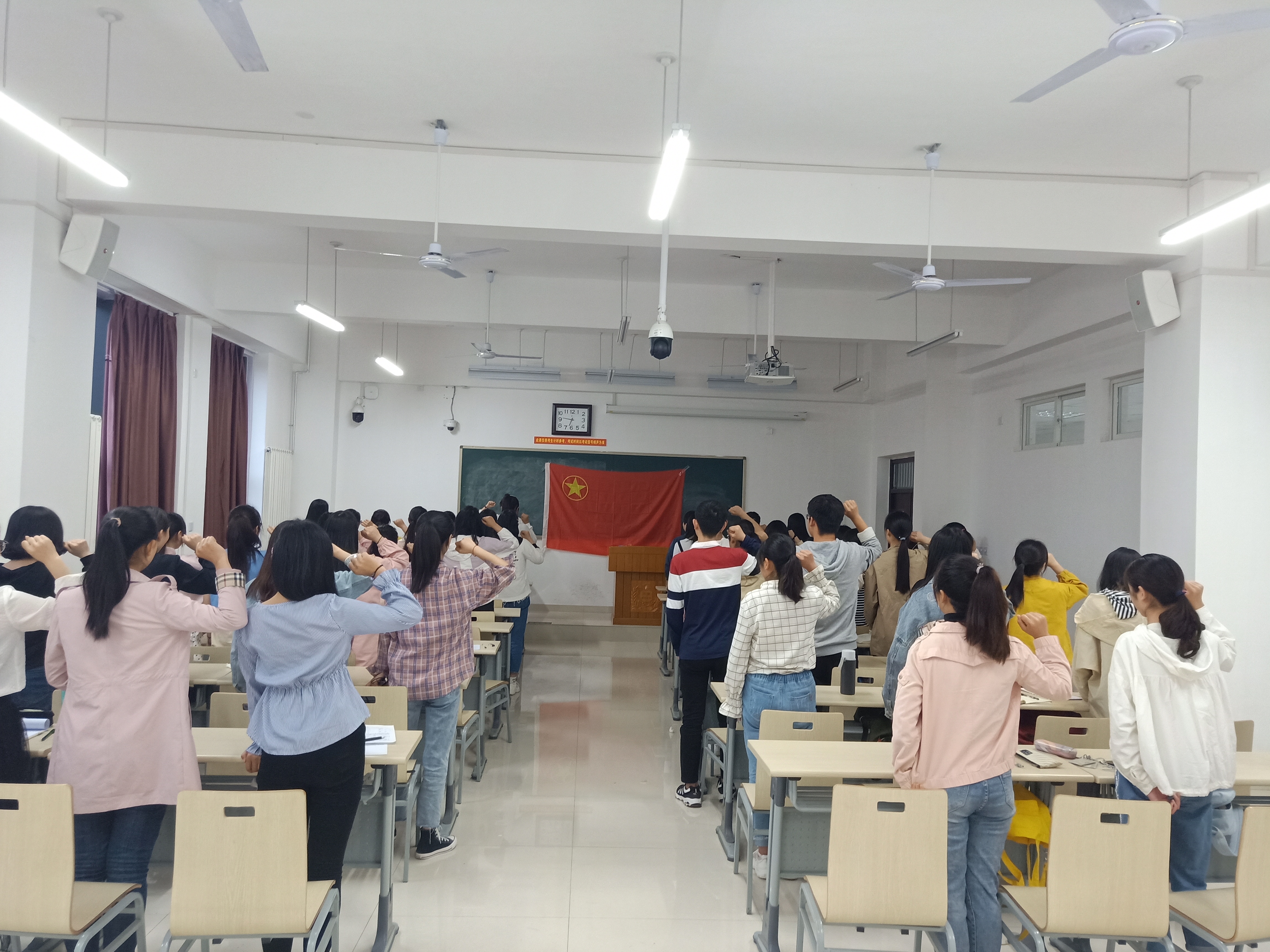 此次活动分为三个部分,第一部分为团支书带领大家进行入团宣誓,第二部分为优秀青年代表开始团旗下的演讲,第三部分为全班齐唱团歌。
