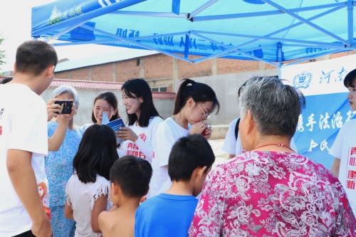 “携手法治行,建功新时代”队伍在集结完毕并筹备完物资后前往驻站地。活动伊始,全体队员在十里铺村村委会楼前广场上布置了宣讲基地,十名队员走街串巷分头进行乡村振兴战略进乡村活动宣讲。宣讲内容积极响应了新乡市参与全国文明城市和国家卫生城市评选活动的号召,主要围绕“产业兴旺、生态宜居、乡风文明、治理有效、生活富裕”的总要求并糅合相关的法律知识开展。活动进行中,十里铺村村民热情地向志愿服务队队员咨询生活中遇到的问题,如乡村土地规划新貌建设等相关争议。队员在为村民答疑解惑的同时对其中较为典型、疑难的问题进行记录为日后研究乡村振兴战略进乡村课题有关方向收集素材、积累经验。全民守法宣讲团队员通过发放有关“两会”期间乡村振兴战略宣讲页的形式,与村民进行交流,让群众了解相关的政策变化,并向其传播生活法律常识以及国家有关乡村治理的新政策。十人的小团队吸引了许多村民前来咨询,现场气氛一片火热。
