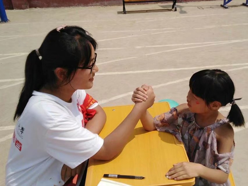 大会开幕前,村主任以及在校老师致开幕词,表示极力支持本次运动会的举行。开幕式结束,各支教老师带着学生有序来到学校门口的文化广场集合,家长也充满期待的在门外等待运动会的开始。运动会项目包括拔河、两人三足、螃蟹赛跑、扔沙包、踢毽子、跳绳、掰手腕、颠乒乓球。孩子们都积极地参与各项项目。运动会一开始的拔河比赛令人印象深刻。支教老师组织孩子们站成四队,两两对战。比赛过程中场面极度热烈,候场的小孩子卖力地为他们支持的队员喊加油。孩子们比完,支教老师为更好调动孩子的激情也比了一场。孩子们看到老师比赛,激动地为老师鼓掌加油。比赛开始,支教老师们拼尽全力拉着绳子,死守防线,各班孩子们竟一拥而上,纷纷跑到老师旁边加入比赛,满是温情。大家都秉持着“友谊第一,比赛第二”的精神,开心地度过了一天。