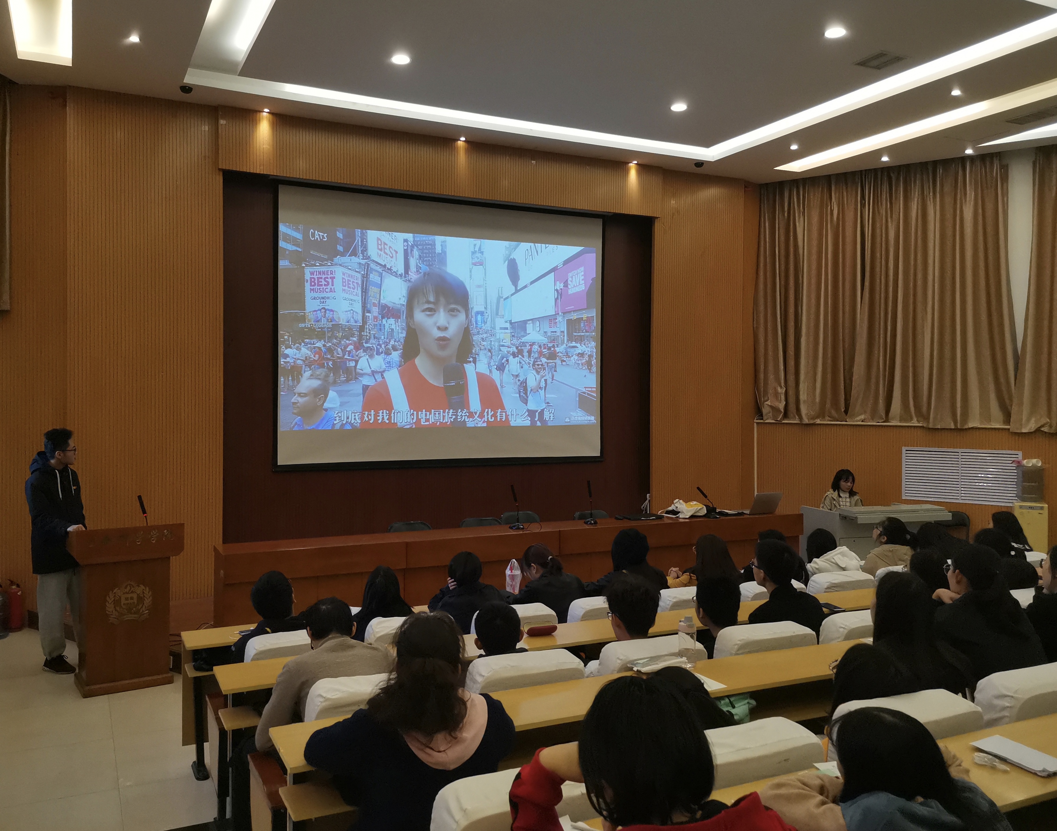 活动伊始,主持人陈强向全体团员们介绍本次团日活动的主题内容、会议流程及意义,接着全体团员起立,齐唱团歌。随后,活动播放《十二风华鉴》的视频,视频简单介绍了我国的传统文化,吸引了全体团员的目光,打开了同学的思绪,调动了学生的积极性。在观看中国记者采访外国友人的视频片段后,现场学生深切体会到我国优秀的传统文化已渐渐走向国际,许多外国人也了解到孔子、丝绸之路等诸多中华文化。借此,陈强围绕中华传统文化向同学们提问。活动进行第二部分:好书我推荐。学生们积极发言,分享了许多中外文学作品。其中,学生常轩硕以PPT的形式向大家详细地介绍余华先生的著作《活着》,他精彩的发言大大激发了同学们的阅读兴趣。活动在《朗读者》节选视频中落下帷幕。