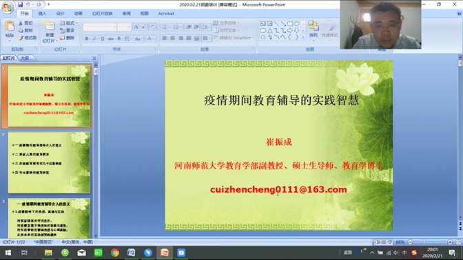 为确保志愿服务活动高质高效开展,校团委精心策划,针对网络辅导的特点,对志愿者进行3次线上岗前培训。校团委副书记张合围绕专项志愿服务活动的重要意义、工作内容、组织方式进行培训。同时要求全体志愿者要做到用心、细心、尽心,竭诚为对接家庭做好服务,遇到问题要及时反馈,确保活动各项工作顺利开展,要践行志愿服务精神,展现出新时代大学生的良好风采。教育学部崔振成老师以“疫情期间教育辅导的实践智慧”为主题对志愿者们进行了专题辅导,分别围绕疫情期间教育辅导介入的意义、居家儿童的教育需求、在线辅导的几个注意维度和专业素养的教育体现四个方面对志愿者们进行了专题辅导。教育学部衡书鹏老师精心为志愿者们设计了以“疫情当前,如何打赢心理‘防疫战’——疫情期间的心理健康防护”为主题的专题讲座,分别从疫情期心理应激的管理应对、疫情期中小学生居家生活学习的建议两个角度切入,重点讲述了六个方面的防护知识:一是如何让孩子正确认识疫情;二是如何缓解和调节疫情带来的消极情绪;三是家长如何陪孩子,与孩子度过有意义的亲子时光;四是如何进行健康的居家生活;五是如何进行有效的居家学习;六是如何借助疫情给孩子上好一堂课。