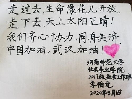 为提高青年学子防控疫情意识,坚定抗疫信心与决心,各团支部组织团员共同观看《等花开疫散,我们一起回家!》《心手相连》等防疫抗疫视频。视频观看结束后,青年团员纷纷为祖国祈愿,手写祝福语,其中2017级社会工作专业李柏元写道:“走过去,生命像花儿开放;走下去,天上太阳正晴;我们齐心协力、同舟共济,中国加油,武汉加油!”