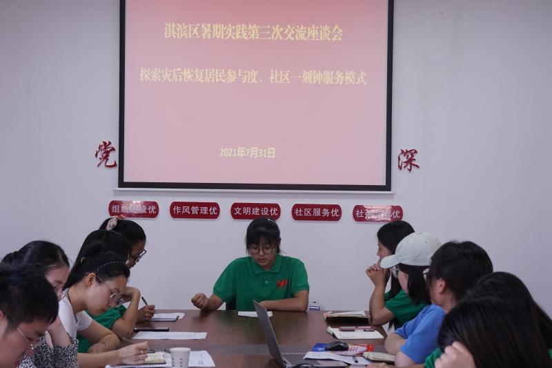 集思广益,共建共享。7月31日上午8:30,以“探索灾后恢复居民参与度、社区一刻钟服务模式”为主题的淇滨区暑期实践第三次交流会于淇滨区社会治理与社区服务局五楼会议室召开,该会议由淇滨区社区服务中心主任郭琳主持召开,淇滨区城市社会治理和社区服务局局长元军平、团队指导老师代梦缘出席会议,21名“志愿服务与城市社区治理”暑期实践调研团成员参加此次会议。