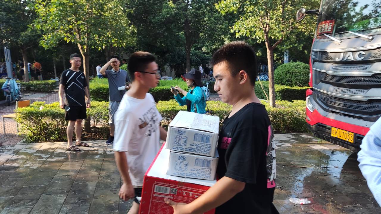 下午,来自各个地方的救灾物资纷纷运送到了淇滨区第一中学校园内,捐赠来源从相关政府部门、企业、小区到个人不等,捐赠种类更是繁多。调研团成员韩冰冰、丁硕与学校老师、志愿者们一起搬送、清点物资。在搬运矿泉水、纸巾、蔬菜箱等物资时,大家整齐地一道排开,形成“人力输送带”,物资经过许多志愿者的手,一颠一跛“长途跋涉”来到贮存它的地方。
