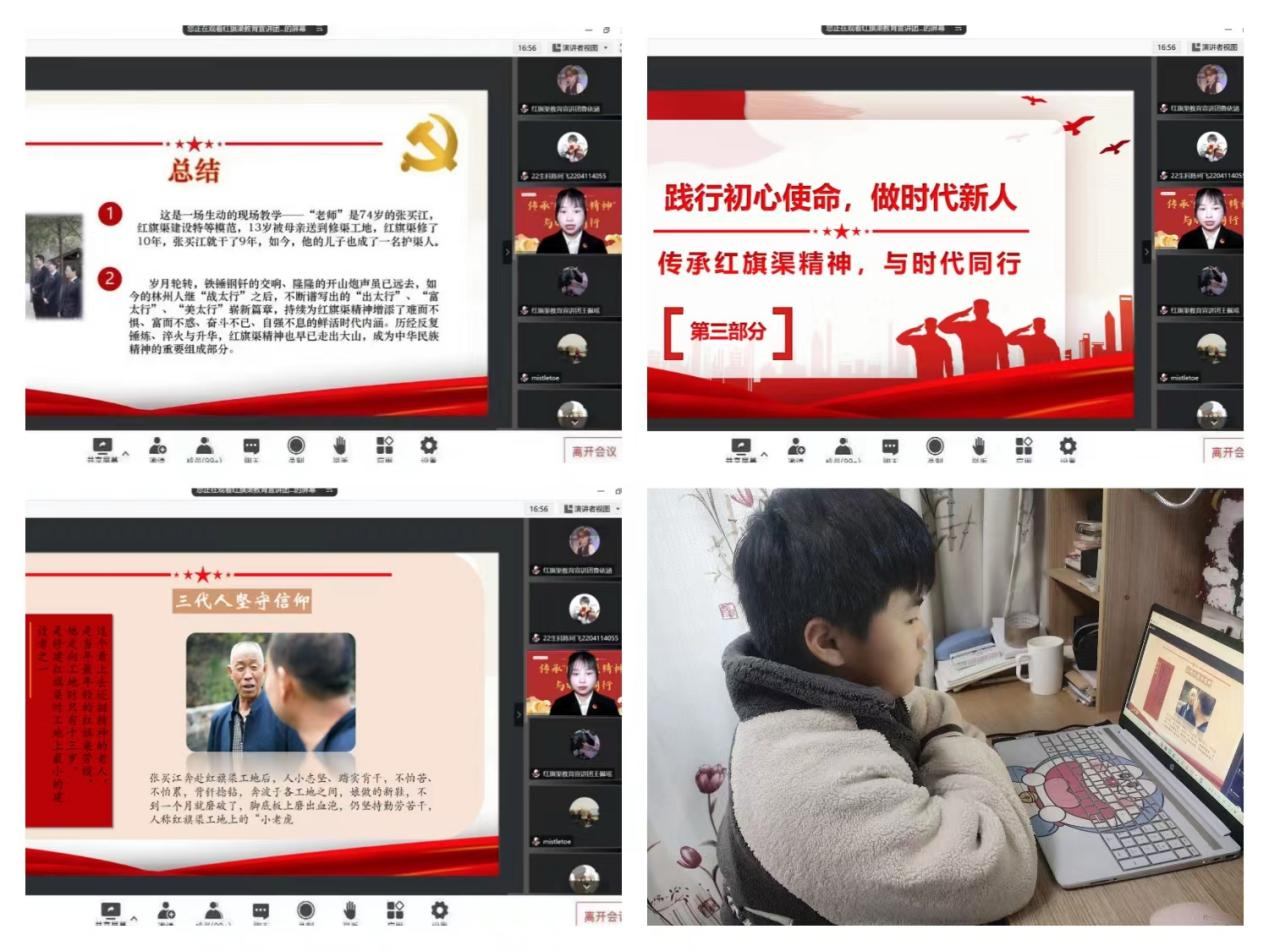 线上宣讲中,讲解员王塬鑫结合资料及自身感受,从红旗渠精神的再理解、红旗渠上的英雄人物、红旗渠精神的传承、践行初心使命及争做时代新人等方面,带领观众全面了解红旗渠精神的形成过程与核心理念,共同回忆这段艰苦卓绝的奋斗史。其中,讲解员王塬鑫重点讲述张运仁、张买江、张学义三代人坚守信仰只为传承精神的感人事迹,带领观众体会林县人民与干旱作斗争的坚强意志和传承红旗渠精神的信念。宣讲结束后,与会学生畅谈学习收获,纷纷表示要继承和发扬自力更生、艰苦奋斗、团结协作、无私奉献的精神,从身边小事做起,在青春赛道上奋力冲刺,共同凝聚起同心共圆中国梦的磅礴青春力量。