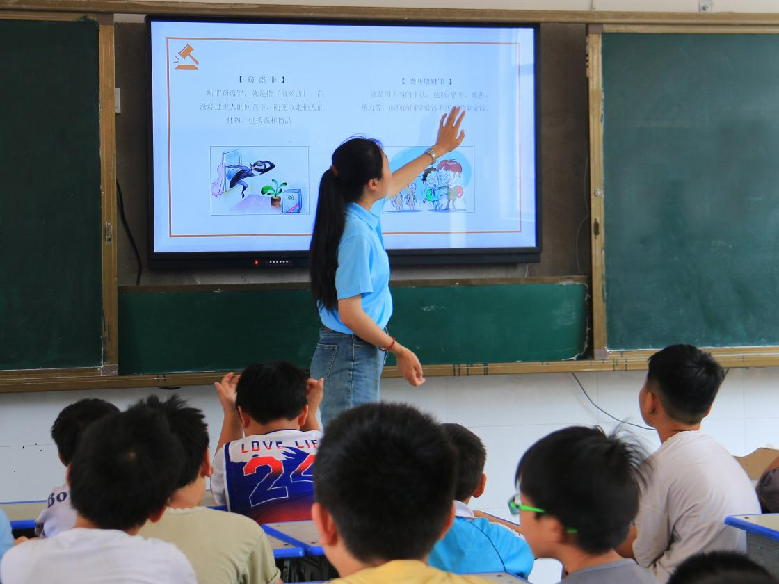 吴琪宇深知法律知识对于学生们的重要性,通过一系列富有趣味性和互动性的教学内容帮助他们树立正确的法律意识。在课堂上,她以案释法、以事讲法,围绕法律的定义、日常生活中的法律常识以及对违法行为的自我防范等方面进行讲解,掀起了一波又一波的学法热潮。严格的法律条文经过大量的互动变得通俗易懂,学生们积极回答问题,分享自己的观点。吴琪宇耐心回答了学生们提出的每一个问题,引导学生明确法律底线和行为边界,强化规则意识,教育学生们要学法、知法、懂法。最后吴琪宇带领学生一起唱小学生法律知识儿歌,在一片欢声笑语中结束了此次活动。
