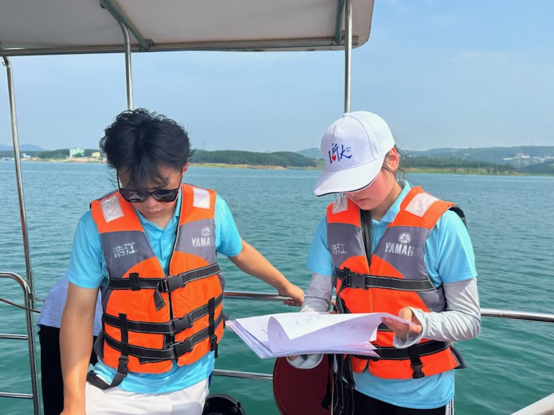 上午8时许,服务团成员按照事先规划,各自携带实验设备到达既定监测点。在完成基本的水生环境调查后,队员们利用浮游生物网和采水器等设备,对监测点位开展全面深入的取样调查,内容主要涵盖:浮游动植物定量与定性样品采集、不同水层深度水样的指标测量以及底泥和底栖动物、溶解氧、总溶解固体(TDS)、电阻率和电导率的监测。整个采样过程井然有序,期间,带队老师耐心指导,及时提醒大家现场采样的注意事项,包括采样深度、取样方法、样品重量、样品编码、样品保存条件等,并对每个点位的样品及相关记录进行审核,确保监测数据“真、准、全”,以期为进一步改善库区水域生态环境质量提供准确的数据支撑。