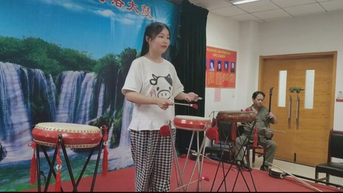 在巩义文化馆的河洛大鼓传习所中,团队成员与尚继业老师交流访谈,了解近年来巩义地区河洛大鼓发展现状。在访谈中,团队成员了解到,尚老师为传播当代曲艺,近年来曾多次组织义演活动。其于今年上半年以来已组织公益演出200余场,演出场地遍布巩义市各个角落,其创作的作品《我是巩义人》、《营商环境创一流》等曾一度获得热烈反响。同时,为保证当代河洛大鼓的高质量传承与发展,尚老师计划于7月下旬组织收徒仪式。收徒仪式是世代河洛大鼓艺人流传下来的传统,也是师徒传承制在当代河洛大鼓传承方式中的体现。在此次访谈中,尚老师曾说道其师门之道:“人多人少一个样,城市农村一个样,环境好坏一个样,报酬多少一个样”。在实践中,尚老师的团队也无时无刻不践行着这样的宗旨,无私为群众带来最完美的演出,以实际行动践行匠人精神。