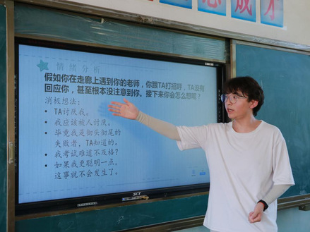 “面对太阳,阴影将落在你的背后。”为帮助小朋友们做情绪的主人,支教团5名来自心理学的实践队员设计情境模拟、讨论分享、绘本阅读等形式,从认知、表达、调控情绪等方面系统地讲解了情绪管理的知识,以活学活用的方式帮助孩子掌握情绪调节技巧。以生动易懂的方式为孩子们讲解情绪ABC理论,从而让他们认识到同一个事件,只要改变认知评价,就能产生不同的情绪;教导孩子们可以通过向他人倾诉、放松身心、参加体育锻炼或公益活动、尽情娱乐、吃喜爱的食物等方式调节不良情绪。小朋友们在快乐中汲取知识,积极参与课堂,许多同学在课后纷纷向老师表示:“通过这堂课,我学会了怎样用正确方法处理不开心。”