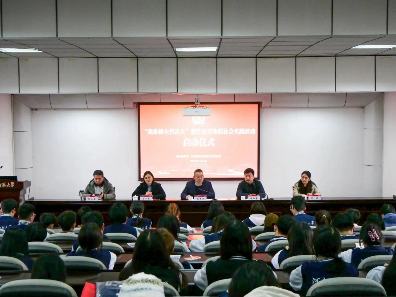 1月14日下午,我校“我是师大代言人”招生宣传寒假社会实践活动启动仪式在勤政楼第四会议室举行。党委常委、副校长聂国兴出席仪式。网上伟德平台处、校团委相关负责人及各社会实践团队队长,共计一百余人参加仪式。本次会议由校团委副书记杨上上主持。