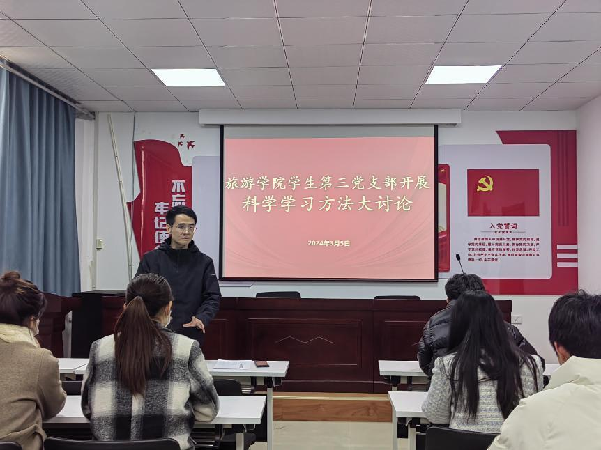 3月5日,旅游学院琢玉楼第二会议室,学生第三党支部书记张志明正在向全体党员传达学校关于大学生“科学学习方法大讨论”的相关精神。与会党员分别针对大学学习环境、目标任务和专业特点阐述大学生应该如何掌握科学学习技巧。通过激烈讨论,形成三点共识:一是科学学习方法要建立在清晰和科学的目标规划之上;二是科学的学习方法离不开披星戴月的勤奋;三是科学的学习方法必须是适合自己,能够持续不断调高自身学习效率。