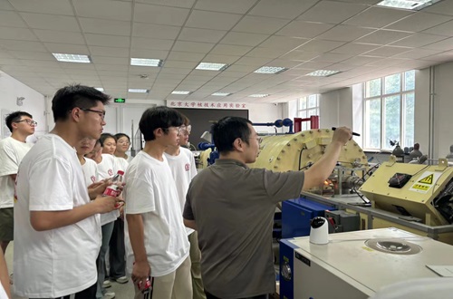 调研团首先来到北大核物理与核技术国家重点实验室,徐川老师向大家简单介绍了2×1.7MV串列大型静电加速器构造及基本原理,明白离子注入/辐照实验和卢瑟福背散射和沟道分析等离子束分析工作在选择抗辐射新型材料的重要作用。在讲解过程中大家积极与老师进行交流探讨,激发了同学们对核物理领域的浓厚兴趣。随后,调研团在胡晗睿等同学的带领下,集体参观了北大亚原子粒子探测实验室,并与科研人员进行了深入交流,了解了原子的超精细结构以及如何探测宇宙中介子衰变时产生的子的性质,进一步拓宽了河师大物理学子的学术视野。