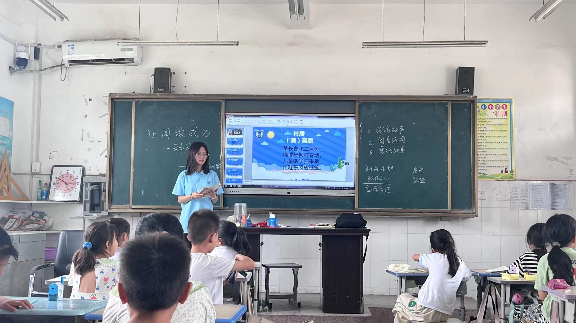 为了让诗词学习变得更加生动有趣,“书香润心·阅读启智”读书小组引入音乐元素,带领学生们开展读背诗词(音乐唱诗词)活动。实践队员选取了几首经典诗词,配以悠扬的旋律,引导孩子们在音乐的伴奏下朗读并尝试演唱。此外,读书小组带领学生们进行了童话故事讲述活动。他们精选了多个富有教育意义的童话故事,通过生动的讲述,让孩子们沉浸其中,带领孩子们走进一个又一个奇妙的世界。
