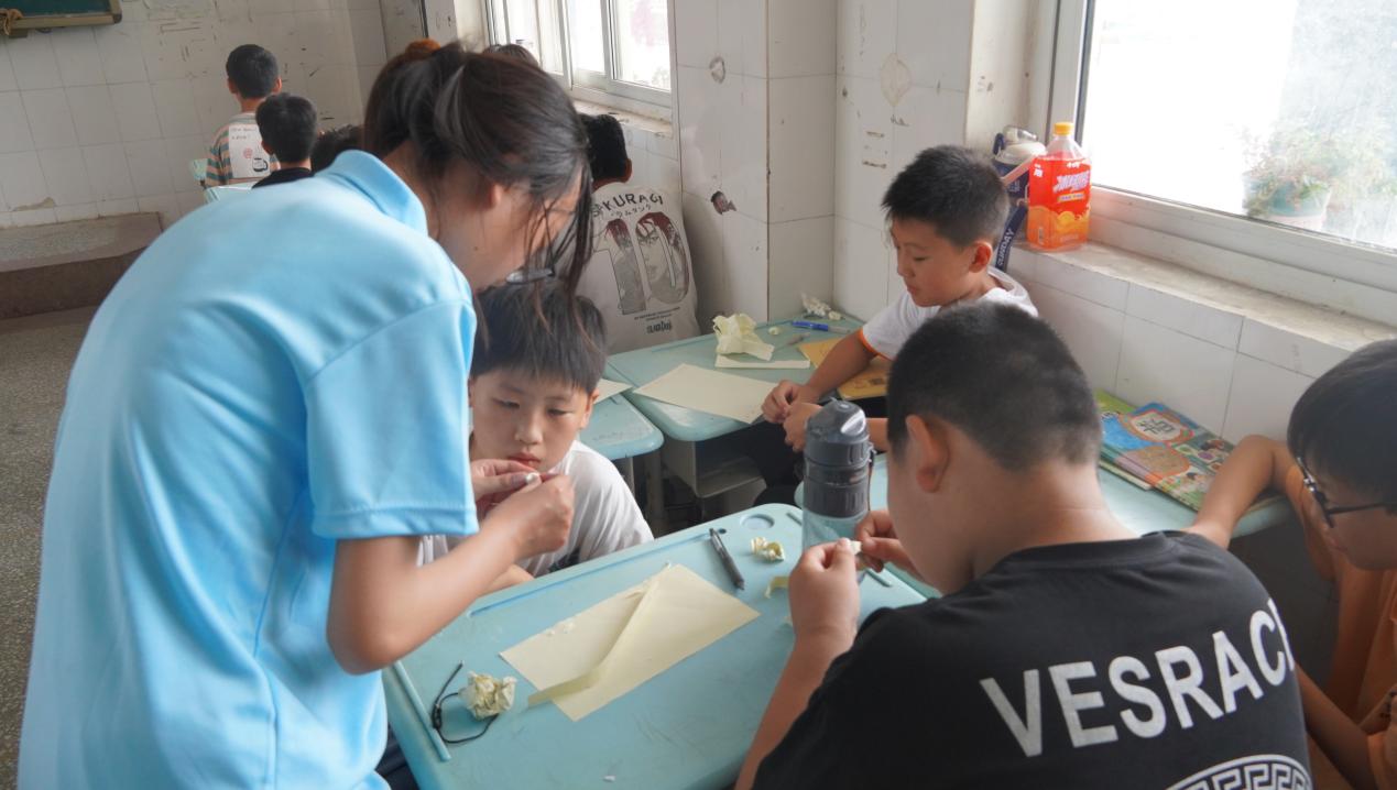 室外是艳阳高照,室内由实践队员带领孩子们开展的“趣味折纸,变!变!变!”课程也是开展得热火朝天。课堂上,实践队员将事先准备好的彩纸分发下去,讲解折叠方式与技巧,孩子们热情高涨,积极配合,折纸过程中又尽显耐心认真,一张张彩纸在这些稚嫩而又灵巧的小手中纷纷变出小船与玫瑰的模样。活动结束时,孩子们把折纸成果纷纷撰在手里,表示今天很开心,学到了许多有意义的东西,一定要把折纸成果带回家展示。