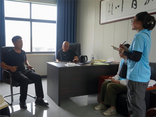 到达目的地后,团队成员首先与村委会进行了交流,了解了孙庄村的基本情况。村委会成员介绍了他们在村庄整治、环保措施及乡村基础设施建设方面所做的努力,展示了“千万工程”带来的实质性成果。接着,队伍来到了孙庄村以绿色生态蔬菜种植为主的产业园区——萤火虫·乡谣农场,并在工作人员的带领下对农场的运作模式和大棚的种植情况有了一定的认识。在参观完农场后,团队成员对孙庄村党支部书记孙中岭进行了采访。在采访过程中,孙书记从农村发展难点、农村改革及落地实施、乡村振兴四个方面进行了细致地讲解,成员们深感乡村发展的不易,同时坚定了奉献乡村的决心。最后,成员们在5号大棚进行了志愿活动,协助当地村民开展采摘黄瓜等一系列工作。村民热情地为成员们讲解黄瓜的种植过程及注意事项,成员们在实践中积累了丰富的农业知识,进一步融入了农耕生活之中。