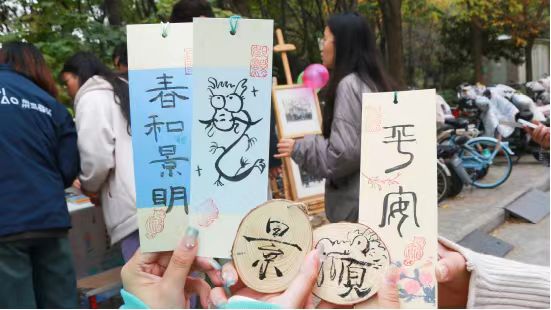 “快看,这是我亲手写下的‘格物致知’。”2023级俊甫书院的关闪闪举着手中的年轮木片兴高采烈地向朋友展示,她刚刚在工作人员的指导下完成了属于自己的创意书签,“我之前学习过一段时间书法,体验在木片上书写别出心裁,让我深刻感受到书法艺术原来就在身边。我要把它挂在书桌前,不断激励我静心笃志、潜心钻研。”
