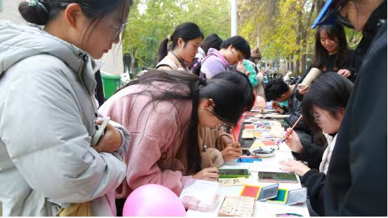 “同学,请在左边摊位领取你心仪的空白书签,有年轮木片、扇形、方形和蝴蝶形书签,之后就可以等待书写了!”2023级美术学院的李诗雨是此次活动的工作人员之一,她站在摊位中间,手中握着花色各异、形态多样的书签,热情地引导簇拥在摊位边满脸好奇的同学。