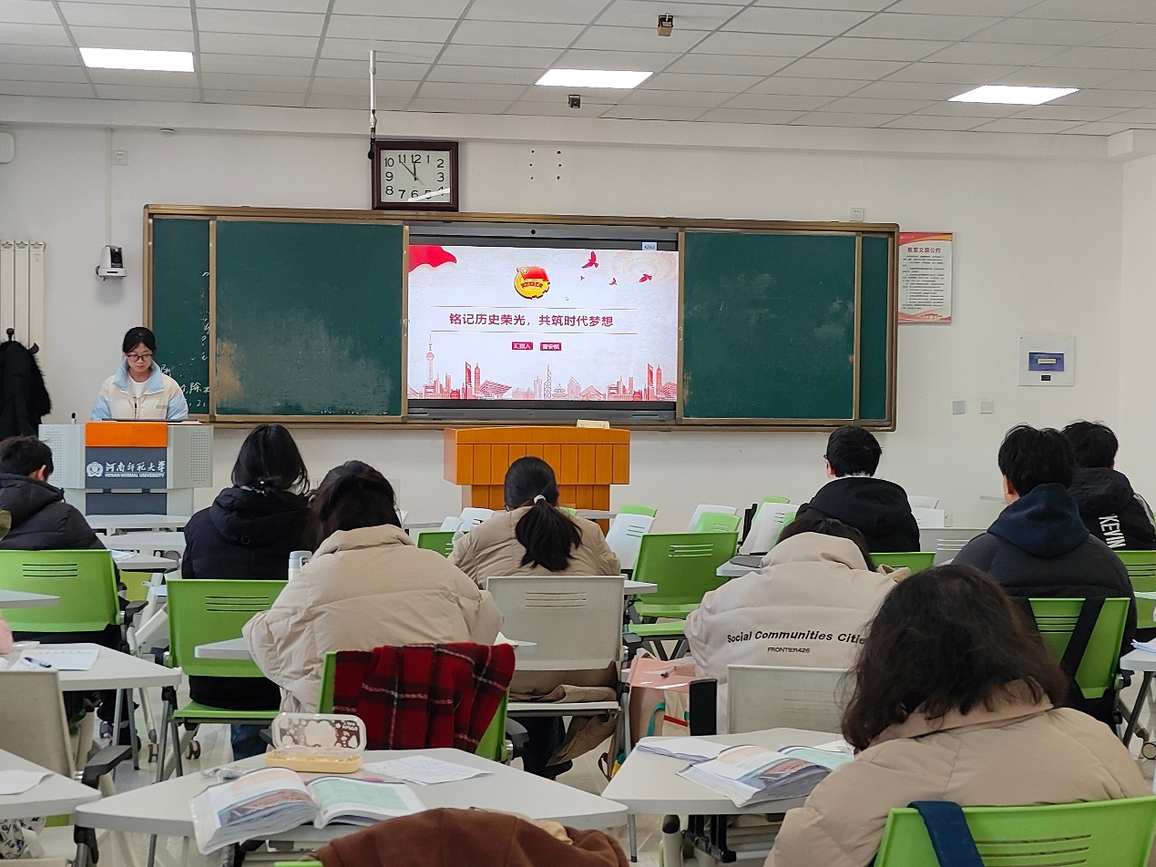 活动伊始,团支书雷安棋带领同学们开启了一场穿越时空的“历史之门”。从古老的华夏文明起源,到近代列强侵略的硝烟弥漫;从革命先辈们浴血奋战的峥嵘岁月,到新中国成立后的砥砺奋进,一幅幅历史画卷在我们眼前徐徐展开。在讲述抗美援朝志愿军战士们英勇无畏的事迹时,大家眼中满是崇敬,冰天雪地中,他们用血肉之躯筑起了保家卫国的长城,为新中国赢得了尊严与和平,这种精神如火炬,照亮了我们前行的道路。