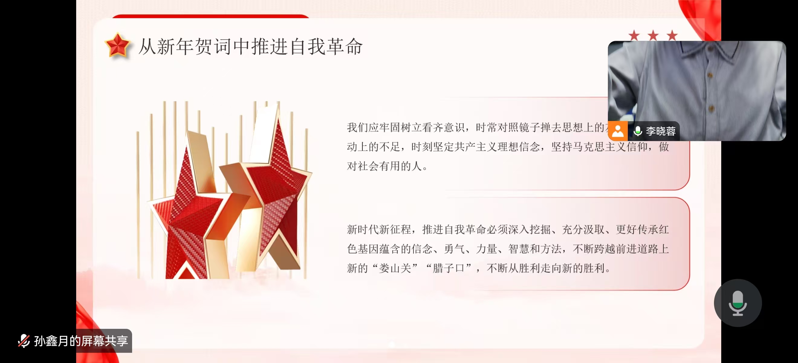 活动环节正式开始前,支部全体成员在屏幕前齐唱团歌,活动也由此拉开帷幕。首先,孙鑫月带领大家重温学习了国家主席习近平发表的二〇二五年新年贺词。贺词总结了过去一年里党和国家所取得的成就,回顾了那些激动人心的精彩瞬间,并畅想新愿景、描绘新蓝图。紧接着,孙鑫月细细地讲述了新征程下我们取得的历史性成就,如国内生产总值预计超130万亿元、粮食产量突破1.4万亿斤、嫦娥六号首次月背采样等。这让同学们不禁感慨这一路的艰辛,每一个数字都是新中国一步步的艰难险阻和不忘初心,始终将人民群众的利益放在首位,关注民生问题改善民生问题。最后,同学们热情高涨,纷纷结合自身,分享了学习贺词的深刻感悟,并对2025年的学习进行规划和展望,表示要在新的一年脚踏实地、踔厉奋发、笃行不怠,为做好一名优秀的学生“充电蓄能”,在新的一年里取得更大的进步。