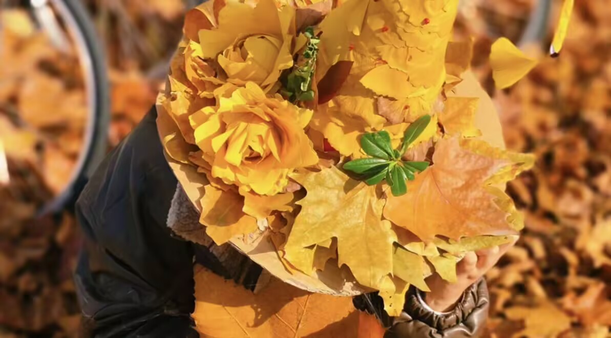 在立体手工视频中,同学们采集银杏、梧桐、枫叶等不同形态的落叶,通过裁剪、折叠、粘贴等手法,将轻盈的叶片转化为立体作品。有的以金黄银杏叶层叠成“秋日花束”,搭配野果点缀秋意;有的用枫叶与梧桐叶拼贴出“秋叶花篮”,卷曲的叶片化作花篮的纹路;更有同学以银杏叶为主体,层层堆叠出尖顶“魔法帽”,帽身用深浅不一的黄叶勾勒出纹理,帽檐点缀翠绿小叶片与红果,仿佛将秋日的奇幻气息都藏进了这顶叶制礼帽中。在诗词贴画视频中,同学们以古典诗词为魂,以落叶为笔。有人选取“疏林红叶落,苍翠动秋山”为主题,用橙红枫叶铺就山林,以黄绿银杏叶点缀秋草,还原诗词中的秋景;有人以“停车坐爱枫林晚”为意境,用深红枫叶堆叠成枫林,搭配浅黄叶片模拟夕阳,让诗句在落叶间具象化。