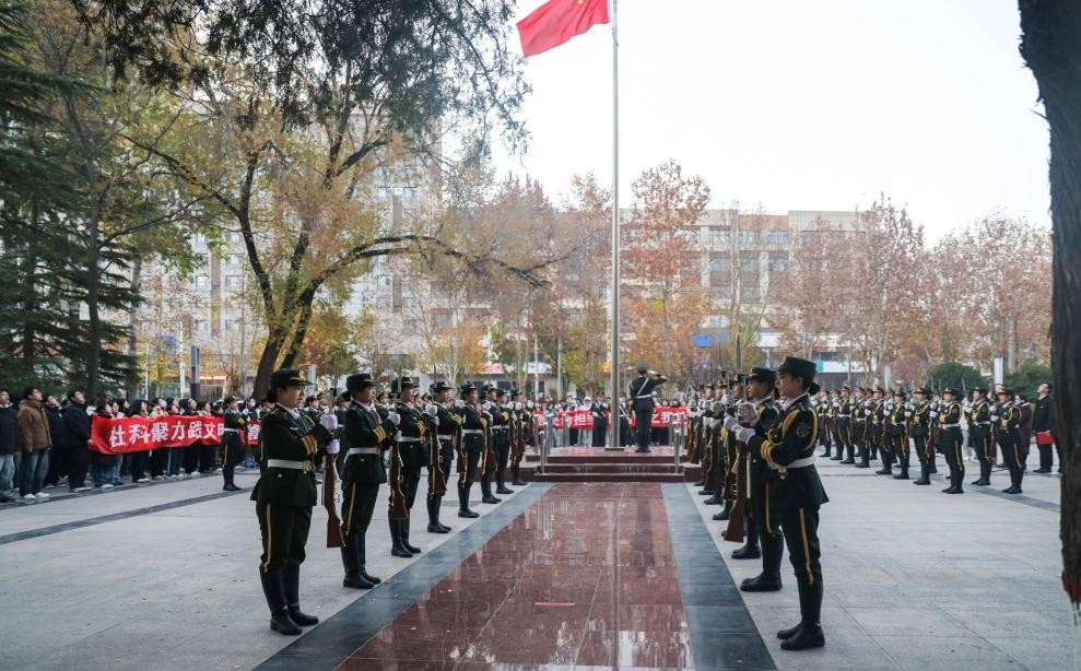 清晨的校园里,历史文化学院师生齐聚国旗台前,以“溯历史长河悟使命担当,以青春之我赴时代之约”为主题,共同开启新的一天。仪式在庄严的国歌声中正式开始,国旗护卫队迈着整齐有力的步伐,护送五星红旗入场。在全体师生的注目礼下,鲜艳的五星红旗冉冉升起,迎风飘扬。