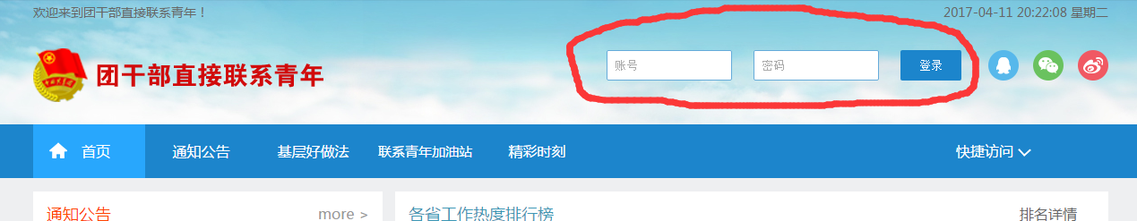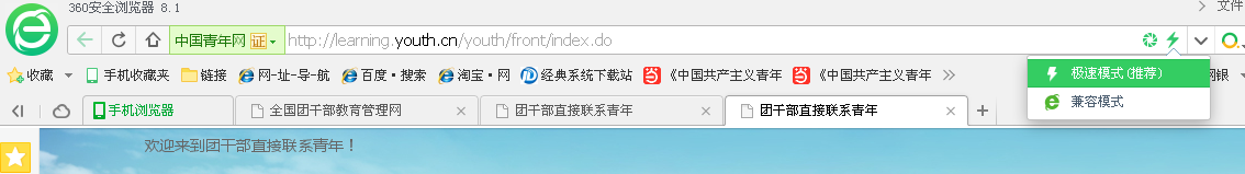 一、录入系统的所有团干部登录网址:http://100.youth.cn/index.do(不要用IE浏览器,要用360浏览器、2345浏览器、猎豹、QQ浏览器等,并将浏览器设置成极速模式,在地址栏右侧闪电标志即是)。 二、团干部的账号为身份证号(身份证号含x的,请切换至大写X),密码为888888(六个8)。有几位老师的名字在录入时因为系统不识别,故后台设置了特殊的账号(具体可见后文附录),密码也是888888(六个8)。