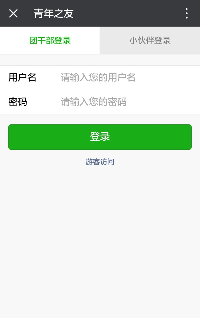 五、手机客户端操作如下: 账号登陆,关注“共青团中央”微信公众号,在底部菜单栏选择“青年之友”选项,即可进入登录界面。团干部选择“团干部登录”窗口输入用户名、密码(与网站一致)登陆,小伙伴可选择“小伙伴登录”窗口输入本人手机号登陆。