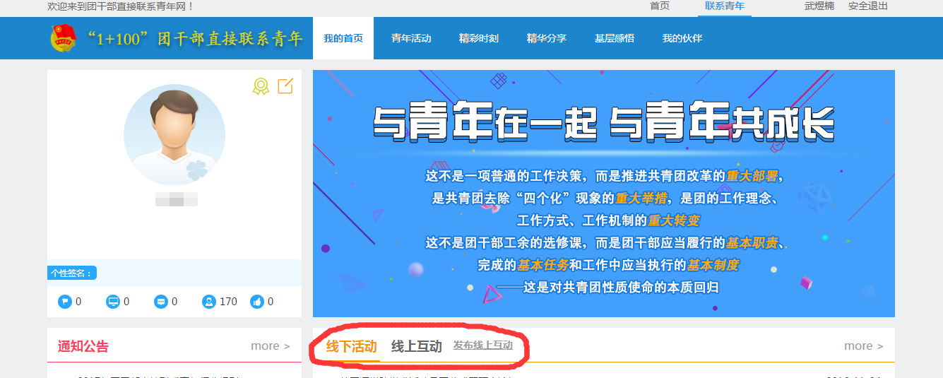 四、完成至少100名青年的信息导入之后,各位可以进行线下活动、线上互动、精彩时刻、精华分享、基层感悟等的分享。