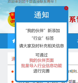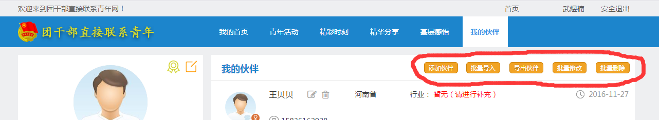 三、各位老师的账号在后台录入时曾经给每个账号上传了本学院100名青年的信息,大家可以在首页—我的伙伴处进行添加或删除。由于今年系统更新,新增加行业一栏,要求联系的所有青年必须重新编辑添加上行业。