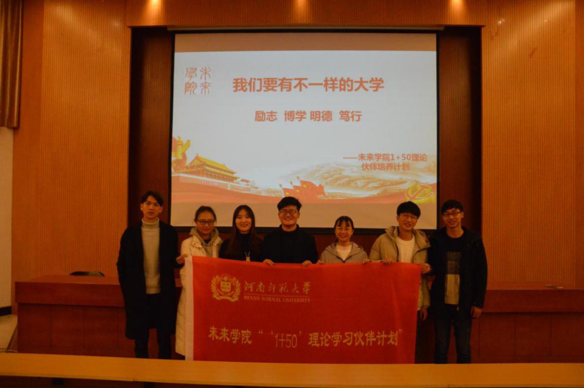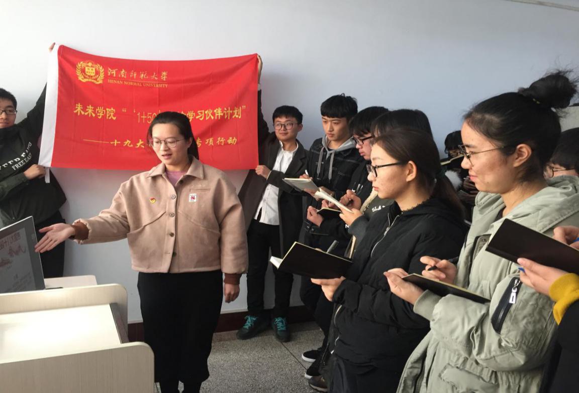 用热血浇灌青春的豪迈,用奋斗带动时代的发展。我校青年马克思主义者培养龙头工程---未来学院,创新性实施“1+50”理论学习伙伴计划,通过鲜活生动、易于接受、朋辈辅导的形式,引导青年学子加强对十九大精神的领悟,活动覆盖学生5000余人。未来学院第八期学员陈雨走进宿舍宣讲时说到,“我们要结合十九大与‘一学一做’的契机,在政治上、品行上、作为上严格要求自己,自觉践行习总书记讲话精神,争做优秀青年。”在我校“我们要有不一样的大学”为题的交流会,未来学院学员王家豪围绕省委书记谢伏瞻来我校宣讲时对青年的八字寄语“励志 乐学 明德 笃行”,讲解了十九大报告主题中的一句“不忘初心,牢记使命”,强调大学生的使命是学习,并就如何高效学习这一问题,与大家分享了大学的学习特点、方法、计划以及如何利用课外资源等。
