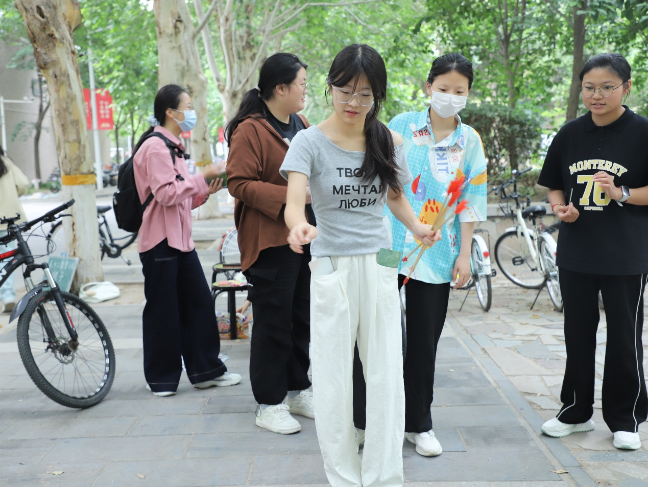 活动创新采用“集章打卡”的互动形式,以崇文楼报告厅为起止点,精心设置投壶、踢毽子、诗词飞花令、端午知识问答、你画我猜五大特色文化体验区。参与者们手持打卡手册,于各点位完成小游戏,收集印章贴纸以此兑换心仪的奖品。投壶活动现场,参与者手持箭矢,尝试将箭矢投入壶中,在游戏中感受古代士大夫文化的雅趣。在踢毽子区域,毽子在空中忽起忽落,划出流畅弧线落下。同学们凝神屏息、调整姿态,在一次又一次精准的抬脚发力中,体会传统体育运动的魅力。诗词飞花令现场,参与者围绕“端午”“屈原”等主题词展开诗词接龙,“路漫漫其修远兮,吾将上下而求索”等经典诗句频出。下沉广场的知识问答区设置了屈原生平到粽子形制演变等题目,在答题过程中深化参与者对端午文化的认知。东校区田径场东侧的你画我猜环节以小组协作形式进行,通过肢体语言演绎端午相关词汇,另一方进行猜测,在轻松愉快的氛围中传递文化内涵。活动尾声,同学们在便签上写下活动感悟与节日祝福。