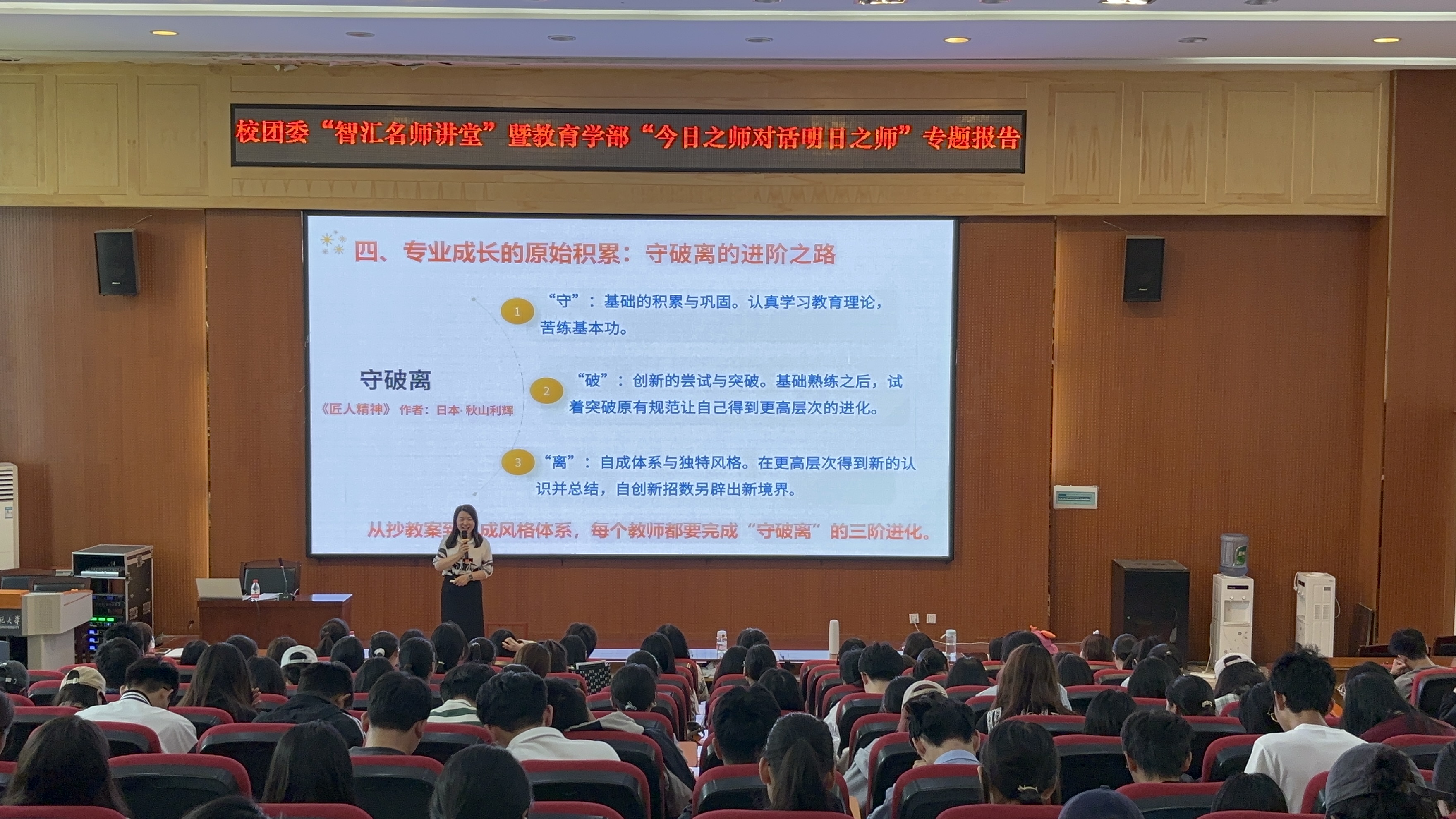 为引领师范生专业能力提升,强化师范生的教育教学素养,5月24日上午,教育学部西十五社区“博雅师承”主题讲座在求是中楼302报告厅举行。本次活动特邀河南省实验小学殷玉丽担任主讲嘉宾。讲座由教育学部党委副书记康淑霞主持。 殷玉丽以“重新开始的勇气——从乡村教师到省名师的职业成长启示”为题,结合自身32年间的六段职业成长经历,阐述了其对师范生职业成长的路径与思考。她指出,教育者需始终保持对职业、对学生的热爱,把握“守破离”的职业成长进阶之路,从注重基础积累,到敢于尝试创新突破,最终自成体系。她认为,每个人都要珍惜生命中的外部助力,也就是我们的摆渡人,但更要注重内在觉醒和自我驱动,建议大家抓好专业理论学习,强化教师基本功训练,保持独立思考能力,勉励大家做一个有梦想的教育者。殷老师真挚的分享和对教育事业的赤诚情怀为在场同学带来深刻启发和动力。互动环节,殷老师结合同学们提出的问题进行逐一回应,现场交流氛围热烈。 此次讲座的举办,为师范生专业成长提供了宝贵的交流平台。教育学部将继续探索“对话”模式,帮助师范生提高就业竞争力,不断优化师范生教学实践能力培养模式,切实打造职业素养高、就业能力强和发展潜力大的未来卓越教师队伍。 |