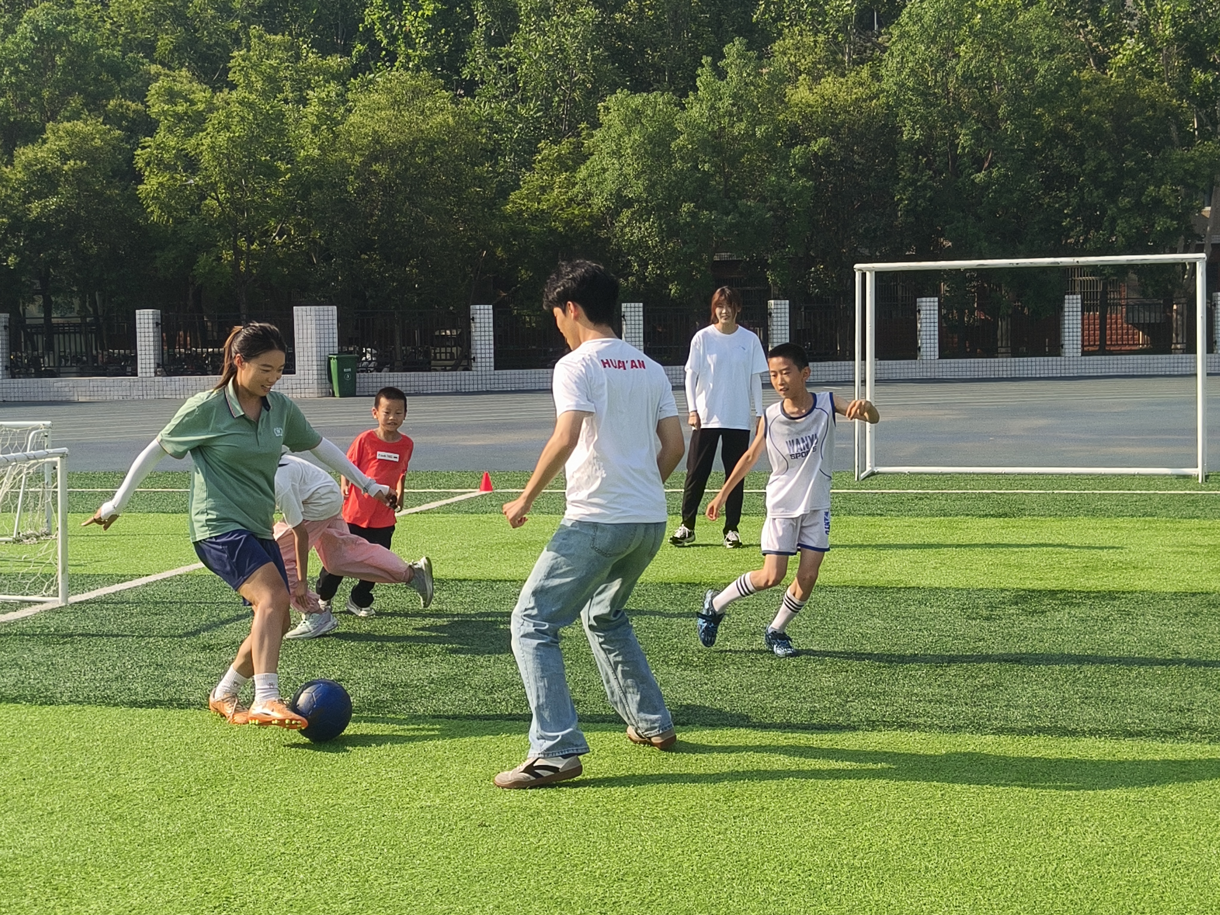 西区操场上,趣味十足的足球启蒙课正式开启。志愿者从脚内侧传球、脚背运球等基础技术教起,结合简单战术讲解,孩子们全程专注投入。每当完成一次成功控球或精准传球,他们都难掩欣喜。球场上,孩子们奔跑跳跃的身影活力四射,即便汗水浸透衣背,也掩不住对足球的赤诚热爱。为让孩子们深刻理解团队协作的内涵,课堂中志愿者精心设计趣味足球对抗赛。赛场上,孩子们默契配合、相互鼓劲,有人积极跑位扯开空间,有人精准传球助攻队友,即使面对强劲对手,他们也毫无惧色。中场休息时,他们围圈交流战术,尽显团结协作的精神风貌。通过系列足球课程,孩子们收获颇丰,足球技能逐渐熟练,从初期各自带球猛冲,到后期主动呼喊配合,孩子们的团队协作意识显著增强。更重要的是,他们对足球运动的热爱日益深厚,在运动中既强健了体魄,又磨砺了意志。