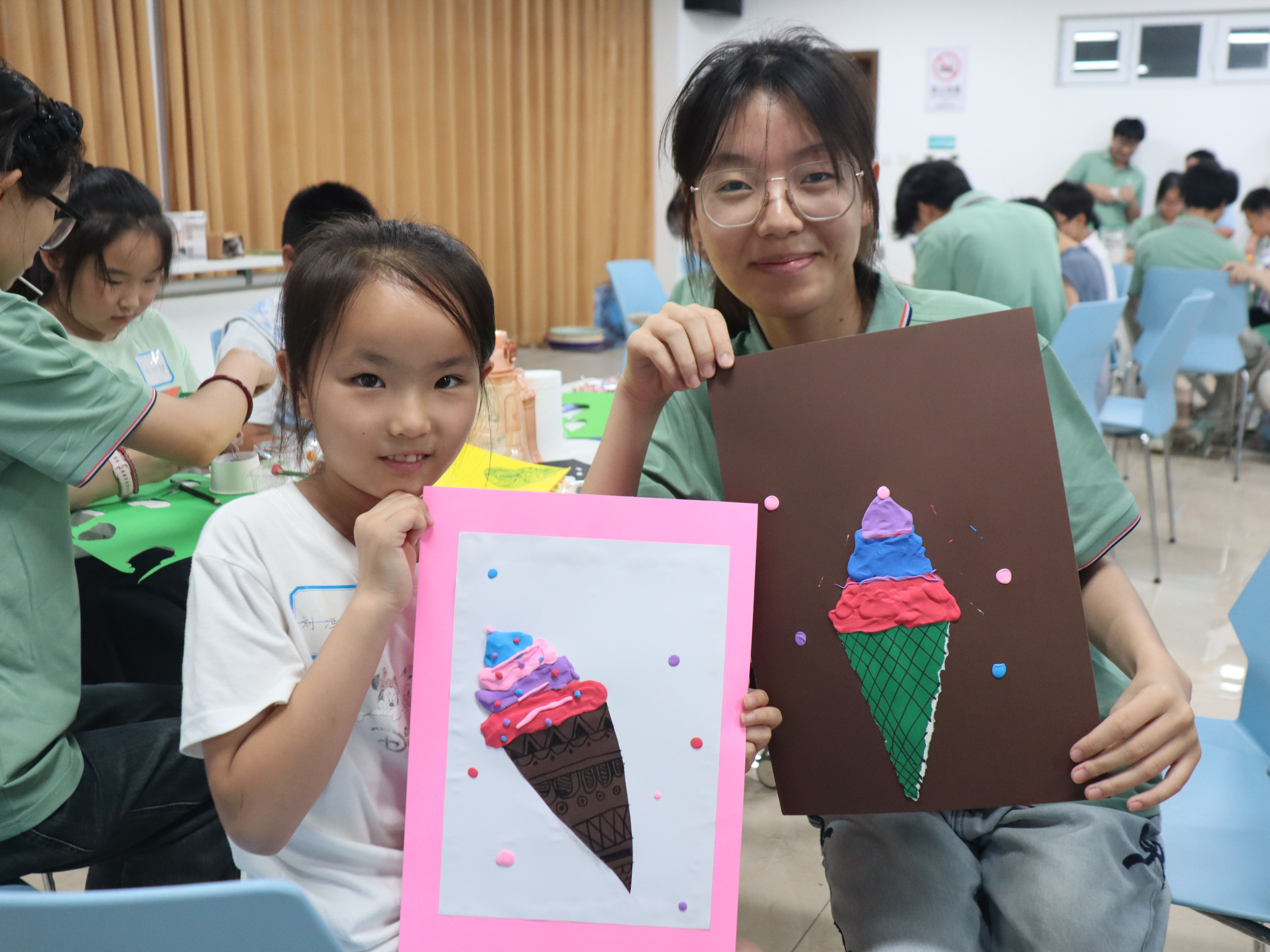 安全教育与艺术创作环节同样精彩纷呈。学生志愿者王鑫鑫以防溺水为安全教育主题,通过卡通展板、情景模拟和互动问答等形式,生动讲解了“溺水正确呼救”“禁止盲目施救”等安全知识。在随后的文艺课上,孩子们在美术学院志愿者指导下,用黏土、彩纸、纸杯等材料创作出富有想象力的作品:卡纸剪成的银杏叶变身孔雀羽毛,纸杯堆砌成“梦想城堡”,朱怡静小朋友更是用黏土和卡纸再现了王顺友的雪山邮路,将课堂所学融入艺术创作。