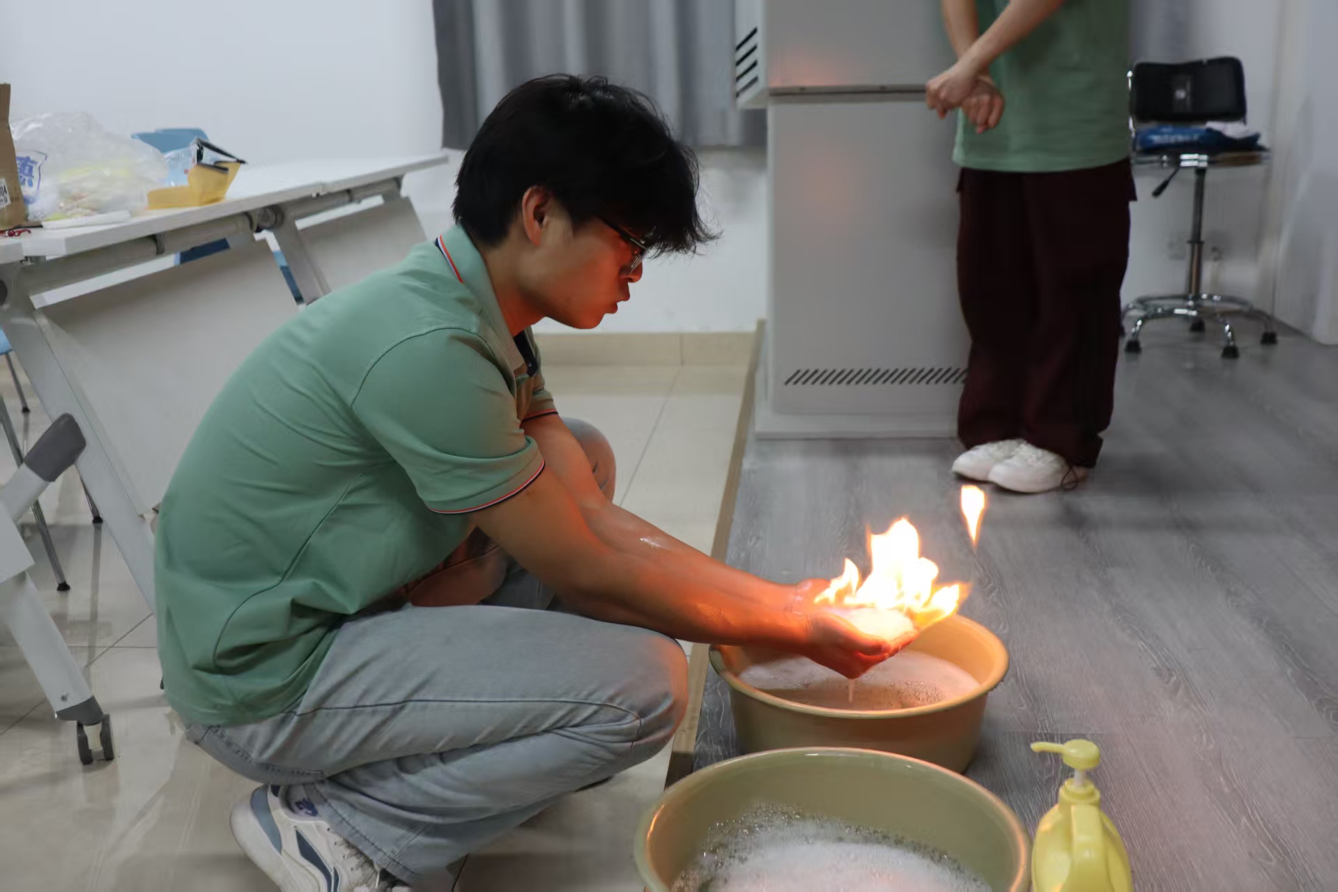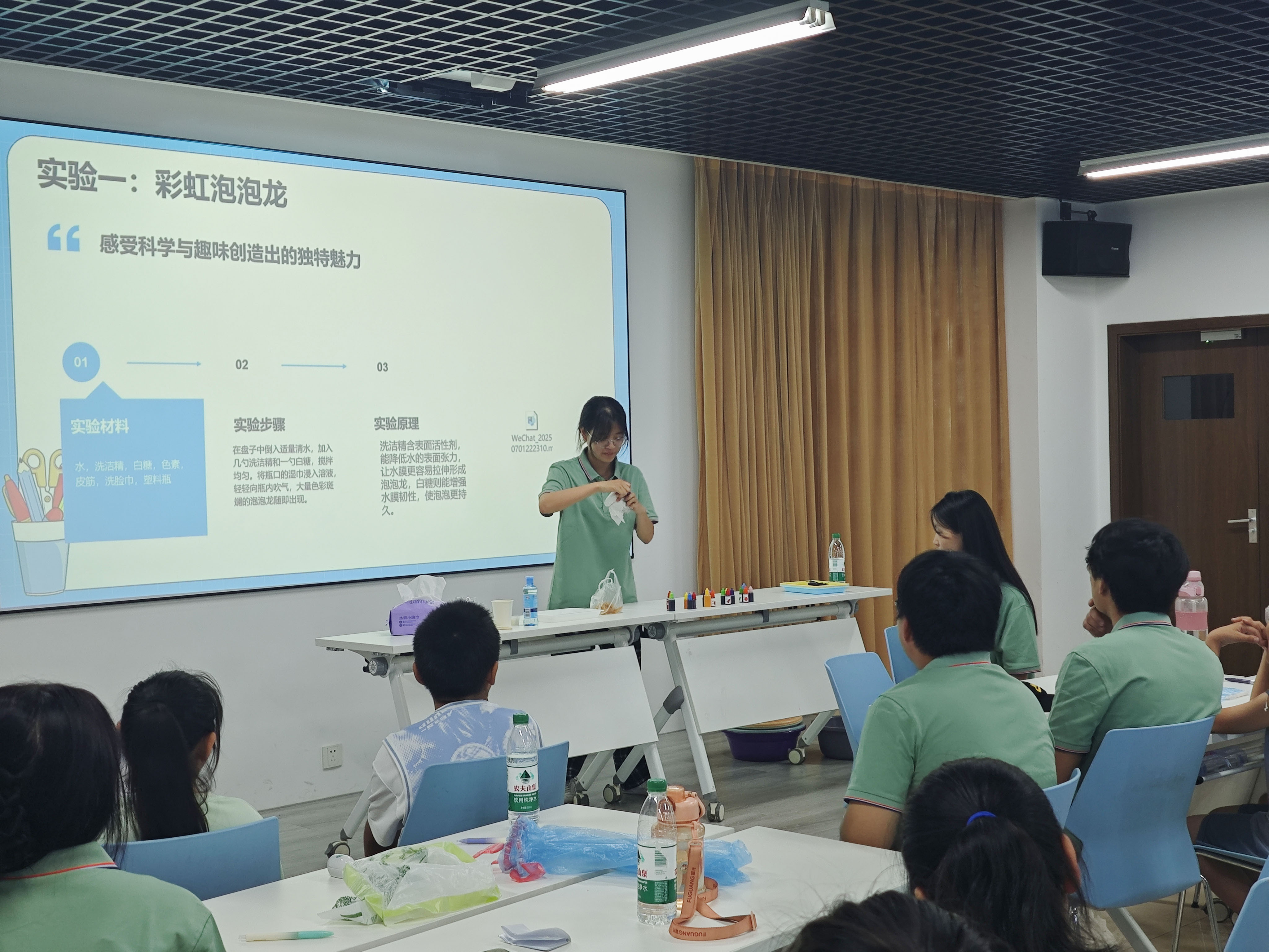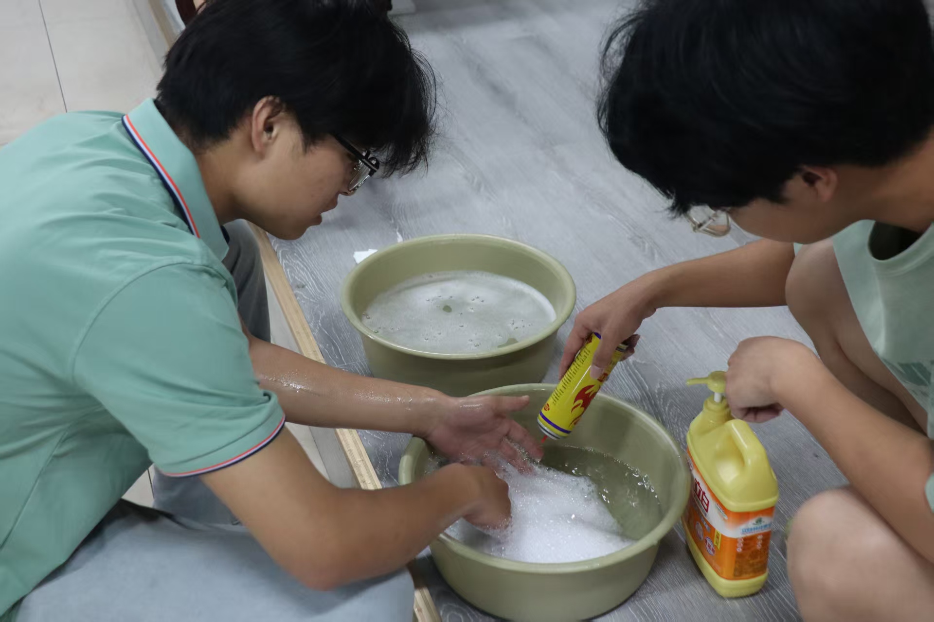 当日下午,支教活动正式启幕,队长钟艺娴主持了一场别开生面的开营仪式,她用“姓名接龙”游戏迅速打破了学生间的隔阂,营造出轻松愉悦的课堂氛围。通过开场动员和规则阐释等精心设计的环节,学生们不仅迅速熟络起来,更在欢声笑语中增进了彼此间的情谊。紧接着,支教团队匠心独运地设计了分组建队活动。学生们被划分为若干小组,在限定时间内确定队名和队旗。在热烈的小组讨论与创意碰撞中,学生们巧妙融合个人兴趣,激发出无数创意的火花。安全教育始终是实验课程的重要组成部分,支教团队在分发实验手册后,细致入微地讲解了安全规则及实验步骤,通过生动的实例与提问,确保每位学生都能深刻理解并牢记实验中的各项注意事项。