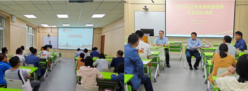 首先,左红亮对学报编辑部一行的走访表示欢迎,并简要介绍了学院情况与近年来科研成果概况,随后刘科介绍了学报的历史和目前发展情况以及此次走访目的,学报编辑部党支部书记、副主任陈留院介绍了学报自然科学版近年来的发展现状、办刊理念、办刊实践等内容,并重点介绍了自然科学版的选题策划与服务师生学术需求的具体举措。在座谈交流环节,部分老师结合所关心的投稿、审稿和文献引用等问题进行了深入交流。